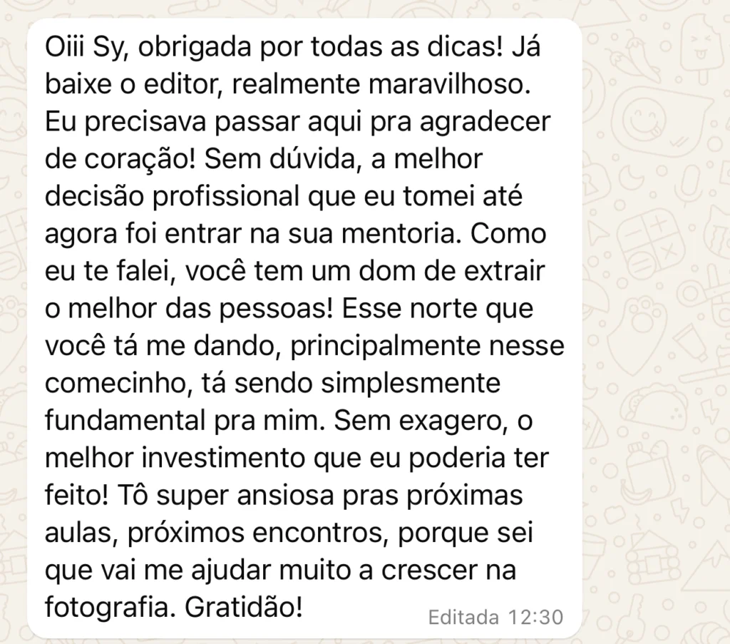 Hoje, além de fotógrafa, ajudo outros profissionais a viverem esse mesmo caminho, com estratégia, posicionamento e segurança para sair da incerteza e alcançar estabilidade. Porque sim: a fotografia é extremamente lucrativa. Mas mais do que isso, ela é poderosa. E quando a gente aprende a vender o que faz com amor, o retorno vai muito além do financeiro.